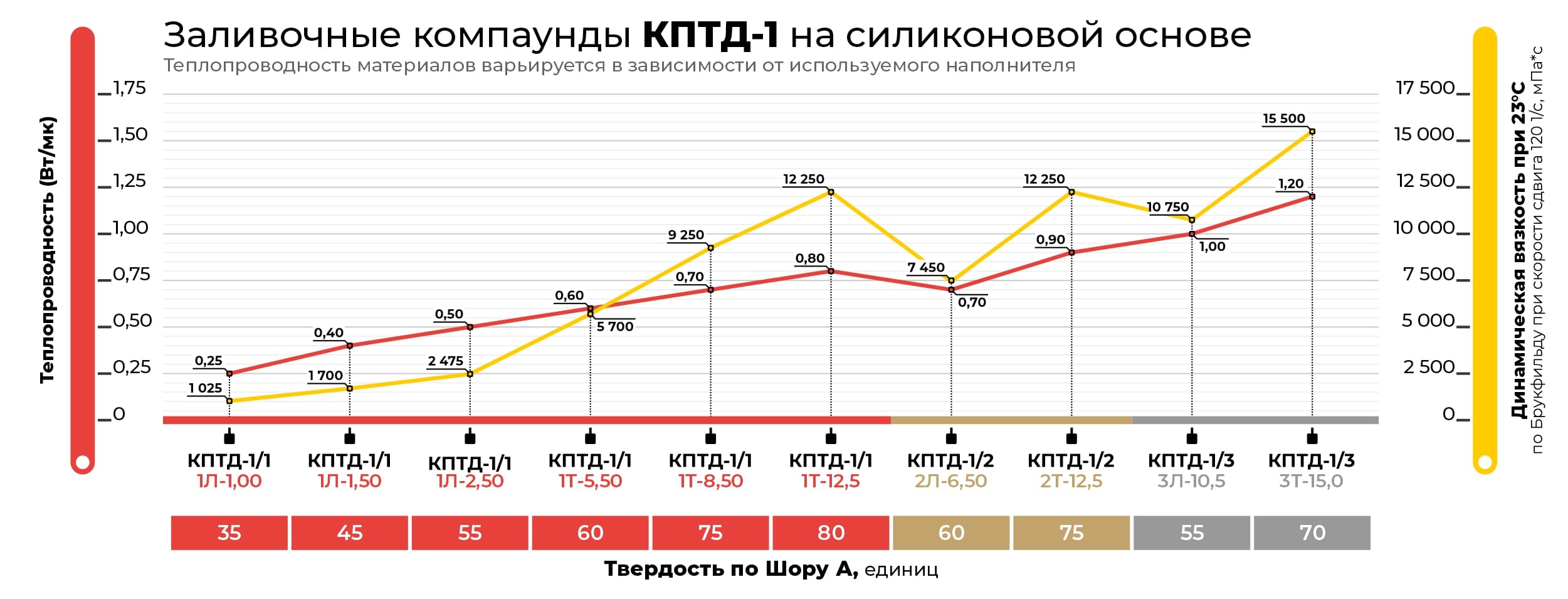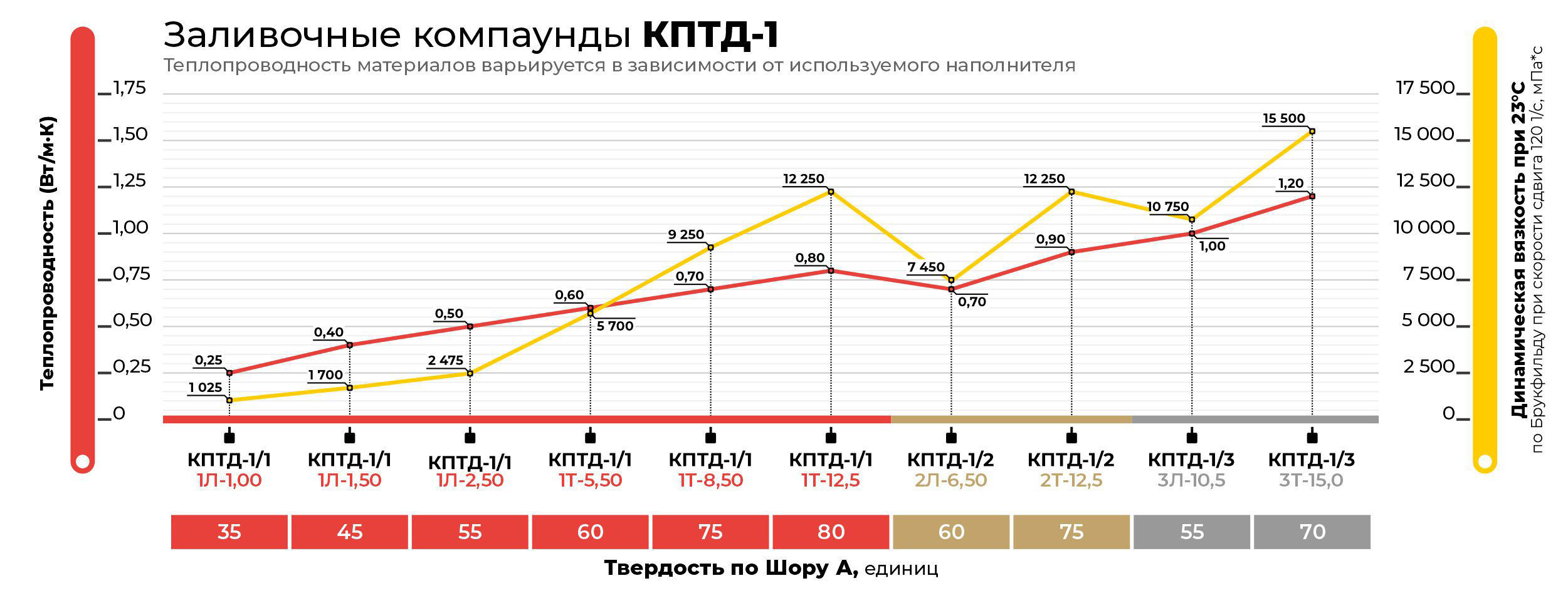 В зависимости от поставленной задачи герметизации и теплоотвода компаунды НОМАКОН™ КПТД-1 выпускаются с различной теплопроводностью в зависимости от природы, количества и дисперсного состава керамического наполнителя, а также с различной заливочной вязкостью. Заливочная динамическая вязкость по Брукфильду составляет при температуре +23 ºС от 0,80 до 18,0 Па*с (800-18000 мПа*с) в зависимости от марки компаунда и является одной из определяющих характеристик при выборе компаунда и технологии его применения.