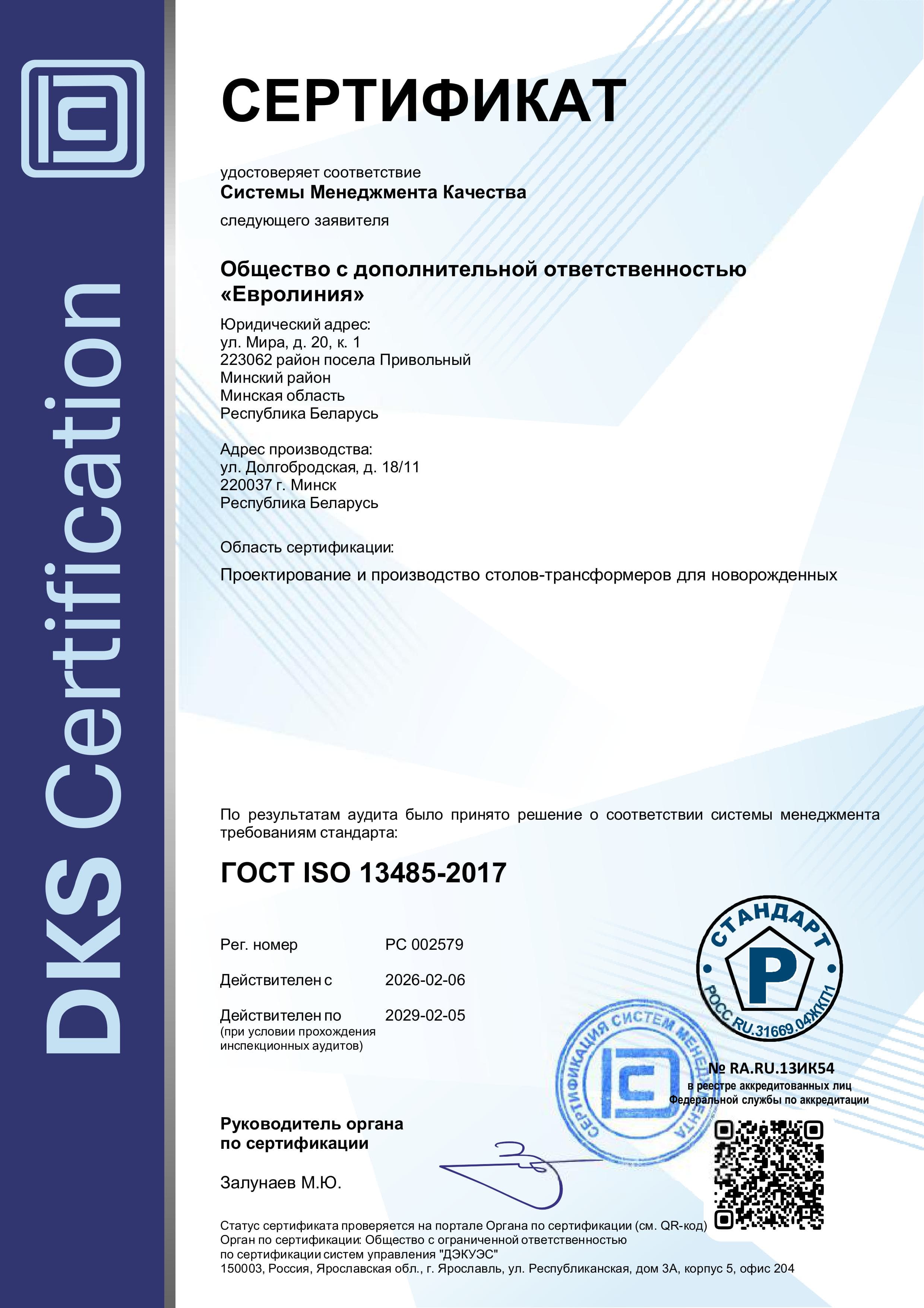 Получен сертификат ГОСТ ISO 13485-2017